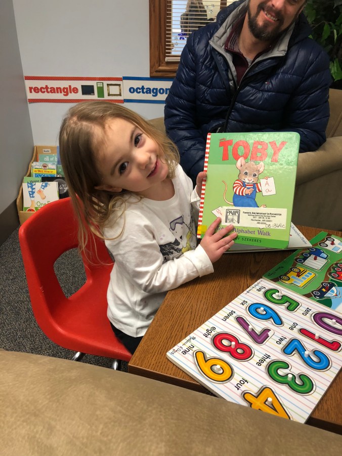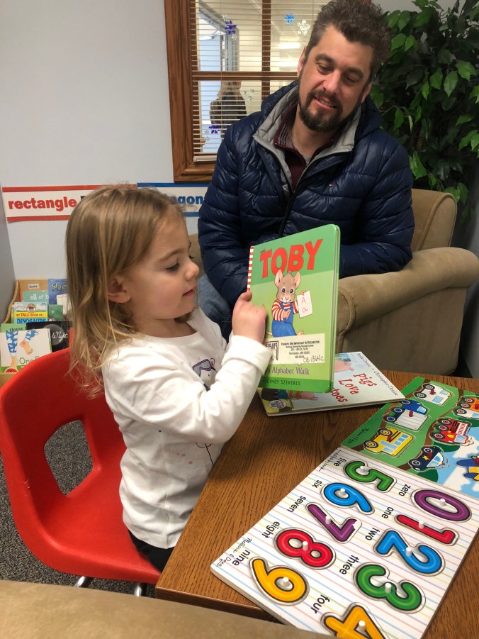 We arrived at the parking lot at the same time, and he ran over to greet Layla and me. I had dropped Maizy at daycare earlier in the day. We had not spent much time together as a group of 3, and I remember it feeling really special for Layla. Right before the appointment, Layla found a book called “Toby,” the same book that Maizy had found at her screening the year before. I took a picture to send to her Papa (Toby), which is the last picture that I got of Aaron.